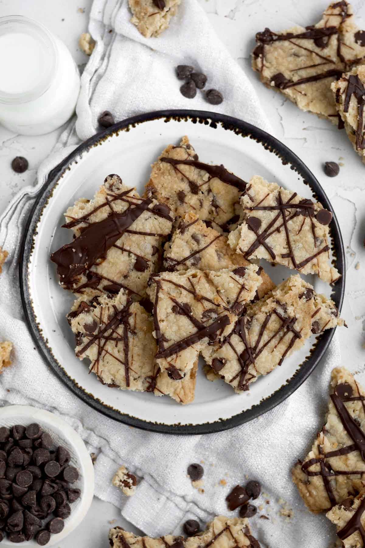 This Cookie Brittle is crispy, airy, flaky, buttery goodness! Loaded with chocolate chips, topped with a melted chocolate chip drizzle, this chocolate chip cookie brittle is like biting into the crispy edges of chocolate chip cookies! With only 6 ingredients and 20 minutes of baking time, you'll have this quick and easy dessert ready to eat in less than 45 minutes! As always it's gluten free, nut free, eggless and can easily be made vegan with a few tweaks!